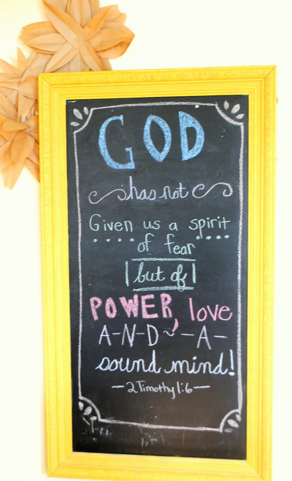 This week I cleaned off the chalkboard and decided to take a minute to write a scripture on it. One that was currently speaking loud and clear to me, specifically on labor/delivery, 2 girls instead of 1, and some dreams I have for the future. The scripture also came in handy this week as Anna Ruth has been pretty sick with a stomach bug. She is on the mend, and as I was up with her in the wee hours of the night this scripture was loud and clear-that I was to pray for her, not fear for her health, or wonder how I would have the energy to take care of her the next day.