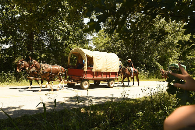 But, every year some folks that participate in the rodeo parade actually walk past our house on their horses and in their covered wagons. They then camp out in a nearby pasture. Isn't that the coolest?!