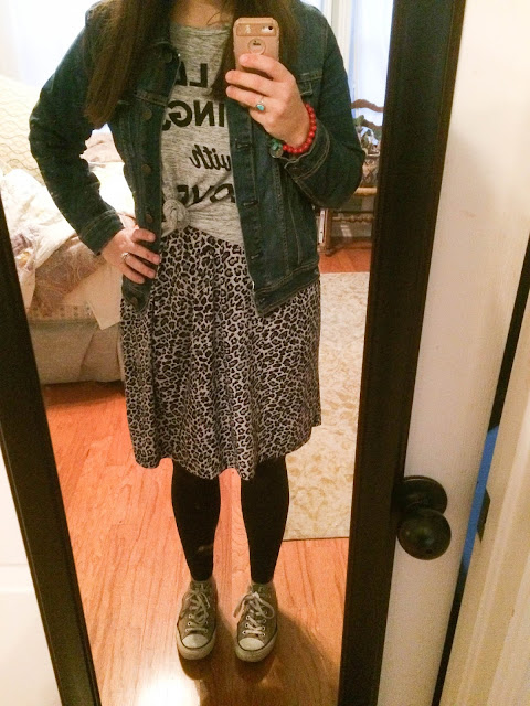 1. I love love love your outfit with the leopard print skirt ... grey t-shirt ... jean jacket ... leggings ... and grey tennis shoes!!! LOVE IT!!! :-)